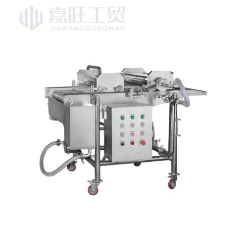 淋漿機主要由輸送帶、淋漿裝置和傳動系統構成。輸送帶采用食品級304不銹鋼材質,